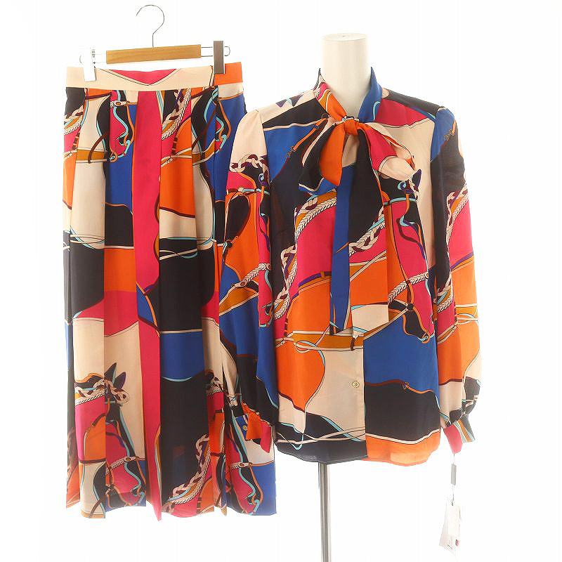 総柄 ボウタイブラウス ロングプリーツスカート セット